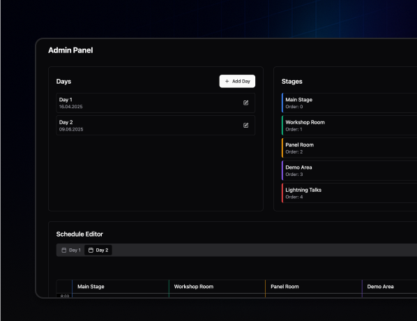 Go live with a clean schedule in hours. Works great for multi-day, multi-track events.