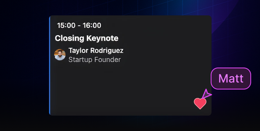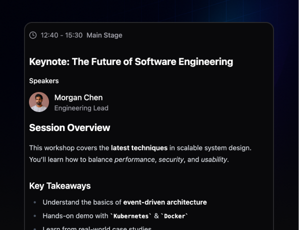 Keep sessions, speakers, and tracks in one spot. No outdated PDFs or scattered spreadsheets.